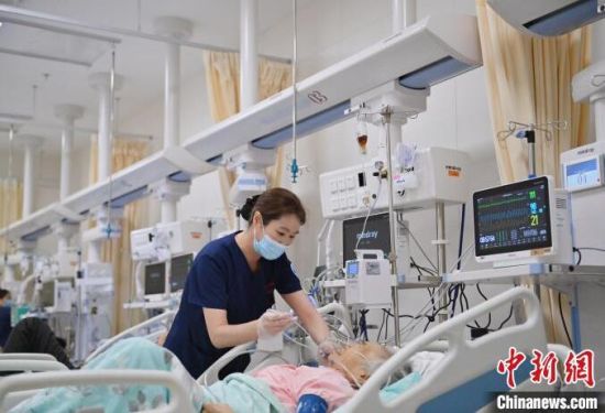 張力(左)對(duì)急診監(jiān)護(hù)區(qū)每位患者的情況都爛熟于心。護(hù)士們與患者朝夕相處,細(xì)心照護(hù),關(guān)系已經(jīng)超出了普通的醫(yī)患關(guān)系。張力說:“他們的親屬不能在身邊陪伴,但是我們每天可以和他們?cè)谝黄,我們和這些患者的關(guān)系像親人一樣! 張瑤 攝